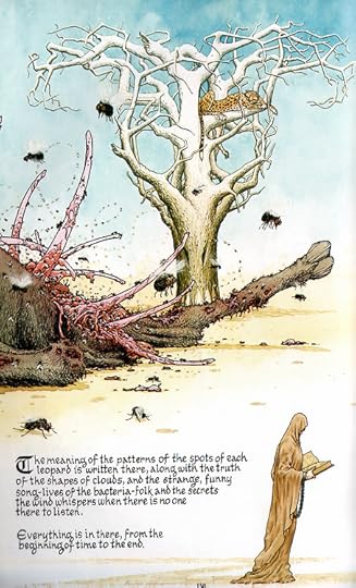 What I’m specifically referring to are the ribs of this unidentified carcass. When I first saw this I stared at that carcass forever…this is an object that’s currently stationary—it’s dead! But you look at it, and by the sheer placement of each rib, you can hear the sound effect it must’ve made when an animal (the leopard?) tore into it. Some disgusting “splgqulrrrrc” sound you make when you squeeze air out of your cheeks. You know which direction it was torn to pieces. You can see into the past…you can see ACTION and movement in an object that is currently still. All by where each rib was placed.