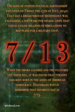 In Democracy Jones: 7/13, I chose a technological breakthrough as the cause for the breaking point. Seemingly outside the purview of important issues that divide Americans, technology is a power structure all its own which, the worst type of demagogue would see as a great opportunity if they were able to control it.