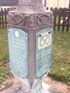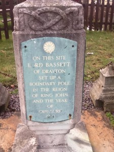 The inscription reads: "On this site Lord Bassett of Drayton set up a boundary pole in the reign of King John and the year of Our Lord 1201″.