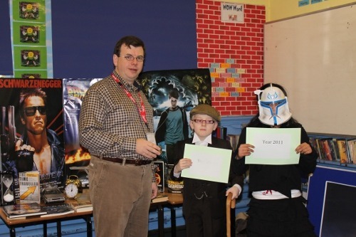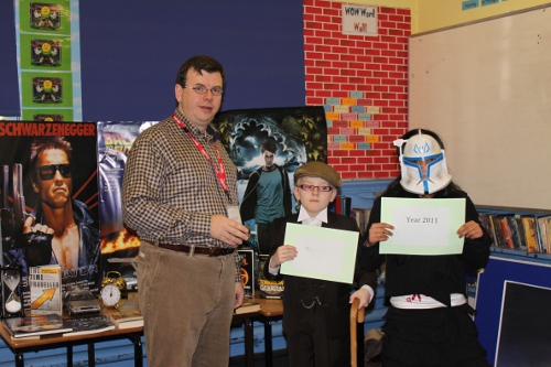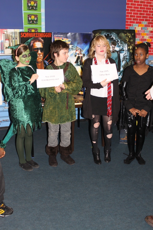 Firstly I have two children come out and pretend to be twins. One goes on a space voyage to the other side of the classroom whilst and the other stays on earth (usually popping behind my screen and gaining my grandads flat cap and walking stick and then emerging). The cards are "atomic clocks" which show the year for both of them