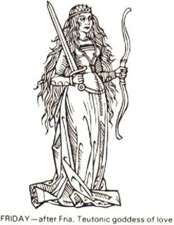 Woden's wife , Frige was the goddess of households and of childbirth. Her name lingers on in our day, Friday from the old English world, Frigesdæg .