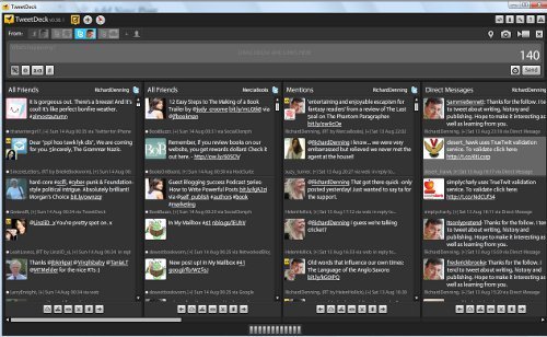 Tweetdeck is a great piece of free to download software. You can setup an account on it and link in multiple twitter accounts as well as Facebook. Then you can set it up so that it has a different column for each Twitter account time line, your mentions feed, direct messages feed etc. See above I have my main twitter account @richarddenning as well as my @merciabooks one, a column for mentions of @richarddenning and one for any messages. Off screen to teh right (and scrollable) i have other columns set up for some regular searches, scheduled tweet etc.
