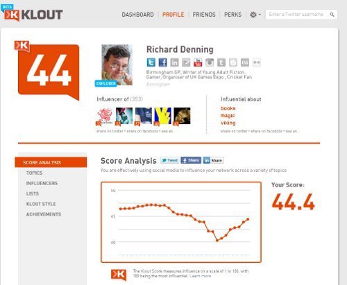 How do you know how well you are doing connecting with people? How can you gauge the success of you activities online? Well this is where Klout comes in. You setup an account and link Klout to your Facebook and twitter account and several other online accounts. Klout then analyses things like how many followers you have, how many retweets you get etc. All that boils together into a score that shows how much splash you are making online. Klout presents its findings in a series of graphs and also places you in a category of online user. I am Explorer at present – finding my way but quite active. What I found interesting was during a recent 16 day holiday when my online access was poor my score fell from about 47 to about 40 which shows that you need to maintain activity at a fairly frequent level to make the most of twitter.