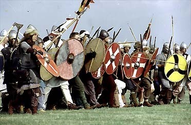 The battle then proceeded in a fairly standard manner with an exchange of arrows, slingstones and javelins. Then the main bodies closed and the push and shove of the shield wall ensued. It may be that the Saxons were doing OK until something unexpected happened. Byrhtnoth seems to have believed that an enemy leader was challenging him and stepped forward to engage in one to one combat. The Vikings fell upon him and cut him to pieces.