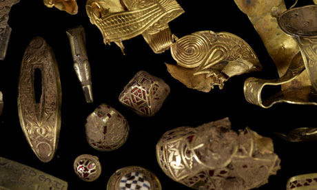 Last Tuesday I visited the Staffordshire Hoard exhibit at Stafford Guild Hall gallery. In 2009 a treasure hunter armed with a metal detector found a vast number (3500) of items of gold and silver in a field near Lichfield in Staffordshire, England. This hoard is the single largest collection of items from the Anglo Saxon period – even larger than Sutton Hoo the great burial treasure of King Redwald of East Anglia. The treasures were purchased for the nation and money provided to preserve, research and exhibit them.