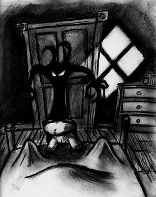 The tattered white rabbit with "Peter" shoddily sewn into the bottom of iys hind paw had certainly once possessed large button eyes, but all he had left were dark spots of worn fur and frayed thread where they should have been. No eyes, nose, or mouth accented that blank swath of cotton. Before the rabbit, he had never thought that a scary face could be constituted by the lack of a face, but that emptiness was filled with such a terrifying expression that it always did Danny in.Peter the Rabbit, like his similar namesake, was highly inquisitive and mischievous, but instead of being fond of ravaging Mr. McGregor's garden, it was fond of ransacking Danny Marble's nerves. Every night when Danny settled himself into bed, Peter appeared, perched on the bookshelf with his head tilted down toward his victim. When the deep night fell and the moonlight awoke the demons from their slumber, the faceless rabbit would start to hop forward blindly, always expecting that more ground lay before him. Of course, the bookshelf was only so wide, and eventually, it tumbled down to the floor with a muffled grunt. It was then that paralysis would strike Danny. Frozen in his fear, he watched as Peter's large black claws emerged from his fluffy paws. A low growl began to rumble in the rabbit's throat until it erupted in a howl that was trapped behind the fabric where his mouth should have been. The bunny clawed at his bedposts, making horribly strangled sounds and desperate grunts of starvation. It was often like that: long hours of listening to the rabbit paw and scratch while that horrid growl echoed in Danny's brain. Occasionally, Peter climbed the post to sit at the foot of Danny's bed with his eerily blank face bathed in moonlight. Danny could hear the rabbit trying to speak, and although he couldn't understand the muffled words, the intent was obvious enough. Peter crawled forward with his claws tearing into the sheets, slicing Danny's legs and arms, and when he reached Danny's chest, he hunkered down on it and a sinister giggle reverberated in his throat. Danny closed his eyes, but he could still see the rabbit's blank face puffing up and stretching as it tried to break through its cotton skin, and with a sickening noise that sounded like fabric and flesh tearing apart, the rabbit began to rip a hole in its face. Although it had been merely thread, cotton, and wool comprising Peter's head, when his face tore open, chunks of slimy gore slid down his chin and thick strings of crimson saliva clung to his fangs as he snarled. Danny could even smell it, strong and metallic and turning his stomach with each powerful hiss from the rabbit's makeshift mouth. The last thing he always saw was the rabbit's skin continuing to rip until the once blank face was a dark, cavernous pit bending over to devour him whole. That's when the second scary thing would usually appear.THE LEGLESS CLOWN [image error] Danny had never been a fan of clowns so the fact that his room was residence to the most terrifying clown he'd ever seen didn't help matters. The shiny red nose at the center of the clown's face always drew Danny's eye first, but it was the unnaturally large, toothy grimace that Danny focused on most. The clown's movement was accompanied by two forebodingly bad sounds. The ringing bell on its jester hat meant it was alive. The high-pitched squeal of the large wheel in place of its legs meant it was coming. Danny couldn't imagine the kind of person that would construct such a hideous plaything. He imagined an evil toymaker atop some dilapidated tower, silhouetted against the moon and convenient flashes of lightning. He could envision the entire scene: the mad toymaker giggled maniacally as he unscrewed the wheel from a toy bike, ripped the flimsy plush legs from a clown doll, and screwed the wheel into its torso. His soul had left a dark imprint on the toy, as he'd done with all of his other ghastly creations. He'd given the clown a horrid semblance of life as well as a squeaky but scratchy voice that sounded as if it had gargled glass. Danny imagined that the clown's resentment toward its maker was what made it despise Danny's other toys to destruction. The clown often went on murderous rampages, tearing the stuffing out of bears and snapping the wheels off of racecars. Only the faceless rabbit was immune to its attacks. Unfortunately, every bit of damage caused by the legless clown was blamed on Danny. He'd learned long ago to stop protesting his innocence; not that he could really blame Aunt Agatha for not believing him. It was always his word against a ravaged room. And sweet as his aunt was, how could she rationalize buying him new toys if he was just going to destroy them? After only two years, his room had become devoid of all sources of merriment. The clown had plenty of it though. It took such unbridled pleasure in Danny's misery, and with each tear that fell, its demented laughter crescendoed to gritty shrieks. Even if Danny managed to block out the laughter and cry himself into a shallow sleep, the clown was waiting in his mind, eager to do far more terrifying things than laugh.Just a few scratches on the window would signal the arrival of the third scary thing. He was glad to turn away from the clown's rictus, but he knew an even more horrible grin was waiting just outside.