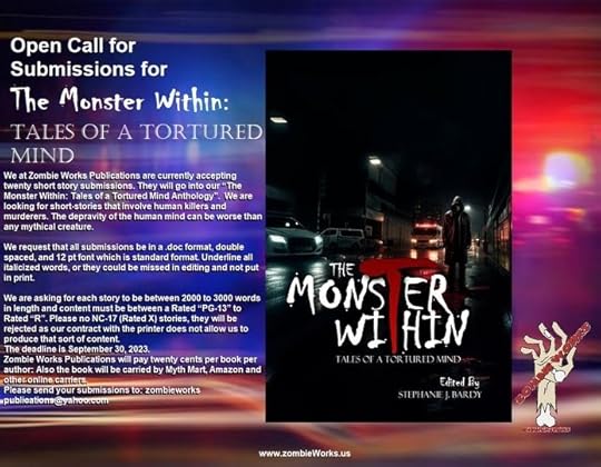 We at Zombie Works Publications are currently accepting twenty short story submissions. They will go into our THE MONSTER WITHIN: TALES OF A TORTURED MIND ANTHOLOGY. We are looking for short-stories that involve human killers and murderers. The depravity of the human mind can be worse than any mythical creature. . . .