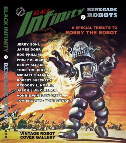 The magazine is the Summer edition of BLACK INFINITY (cf. March 22, 9, et al.) with my part of it taking up only four pages, starting second in the lineup (opening editorial excepted) on page 43. Some other stories, of course, are longer. The magazine’s theme is RENEGADE ROBOTS — given its size, it could almost be thought of an anthology on its own — with both old and new fiction including classics by authors like Robert Sheckley and Philip K. Dick. Plus two “Special Features” (one a reminiscence of “Robby the Robot”), Departments, and closing the issue an eight-page comic.