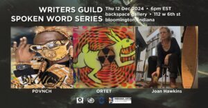 It started with a little more than the usual music at the December “Bloomington Writers Guild Second Thursday Spoken Word” (see November 15, et al.) at Bloomington’s downtown Backspace Gallery, adding a couple of guest musicians to the musical opening by ORTET. Then the first featured reader, an always innovative PDVNCH offered five poems informed in part by rap rhythms, using his voice in places as almost an instrument through tone and pitch as well as just reading words. And the Writers Guild’s own Joan Hawkins, as second featured reader with an essay about the AIDS crisis in San Francisco, “The Plague Years,” in part in recognition of possible similar hard times ahead was accompanied by background music and sound, again by ORTET and guest musicians.