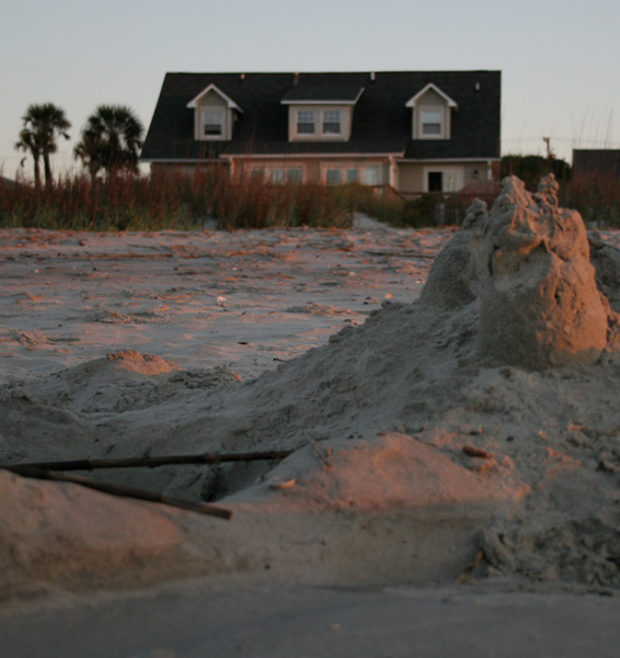 Here's our beach house; in the foreground is the sand turtle with a castle on its back that we made on Thursday, that was still there on Saturday when we left.