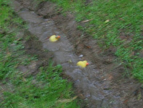 That's the culvert and the little connector ditch I blogged about recently. You can't tell from the picture, but it's raining. Also, if you look closely there are two rubber duckies floating down the rainwater.