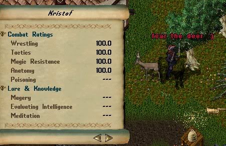 Well, I was saving screenshots from a MMORPG I played obsessively for many years, Ultima Online. Here's a picture of my tamer, Saint Vincent (named after one of my cats), showing off his maxed-out pet deer. Those of you who never played a tamer in UO will have no idea what that means, but the typical pet in that game was a dragon or something, not a deer and training low-level animals to 100% stats was not easy. You'll note also that the deer's name was Kristof. Yes, I had just finished writing the first draft of The Weredeer and tamed and trained a deer in the game to commemorate it.
