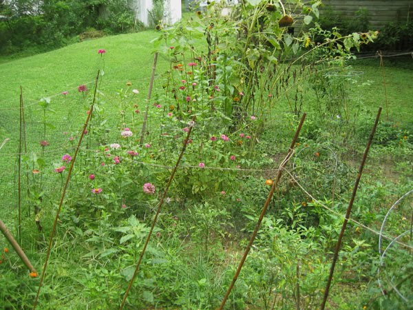 I can't believe how fast this summer is going. Here it is August already. The garden is looking very August-ish: tangled, messy, and just the beginning of autumnal browns and golds among the leaves. The tomato plants are not very visible in this picture because they've gotten so big they've toppled their cages and are lying along the ground, sending down roots from their stems and letting the heavy tomatoes rot amid the weeds.