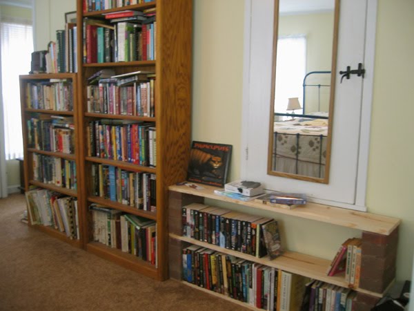 I finally decided I had to do something about all the books on the floor of my bedroom. My to-be-read pile is out of control and taking over. Accordingly, I moved the loveseat out of my room to Mom's--I never sat on it anyway, as it was piled with books--and put together these ubercheap brick-and-board shelves in the awkward spot under the linen closet. All the books on the new shelves, with the exception of Prowlpuss that I like to display because I love the cover, are my to-be-read books.