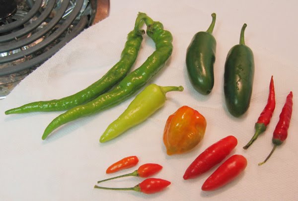 It's not the first of the month, but have a picture of my peppers! These are a few varieties that have started producing. From left to right, top to bottom: the very long ones are immature cowhorns (they get really big if you let them grow), then a pair of mammoth Jalapenos, then two smallish cayennes, middle row a banana pepper, my first sort-of-ripe Habanero, two puriras, and bottom row is a Tabasco and two NuMex variety peppers--Sunrise, I think, but possibly Twilight. I planted both and f...