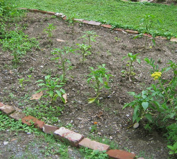 All the pepper plants have been sold, given away, or planted in my garden. Mostly planted in my garden. I'm getting...tired...of peppers. Here's the front garden, which is small and planted in mild peppers: