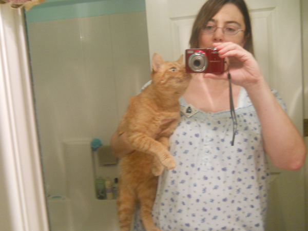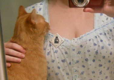 I almost forgot I wanted to post a picture of my awesome new Mister Ghost badge that I got from Evil Supply Company. That's why I am wearing my nightgown in the photo; I was too lazy to put a real shirt back on. I wanted to show Jekyll investigating the badge, but he was much more interested in the camera, which is odd because he'd never seen the badge before and I follow him around with the camera like his own personal paparazzi.