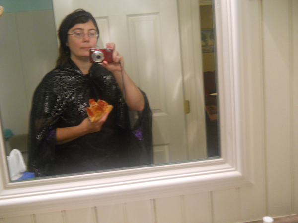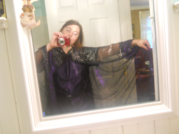 I made a complicated costume that actually turned out really well, considering that in the end it was mostly held together with safety pins. I don't have a long mirror so I couldn't get a decent picture, but here are two pix I did get in the bathroom mirror. The shiny is the batwing cape I made from some gorgeous lacy cloth.