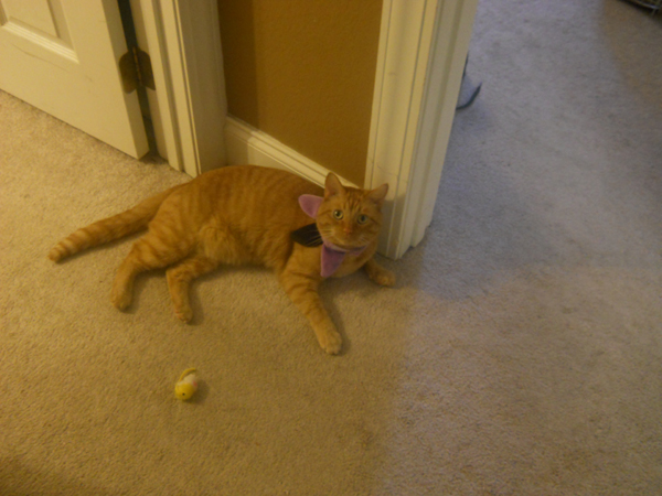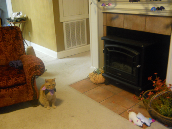 Jekyll wore a costume too. It came with a little hat but the costume was made for dogs and the hat wouldn't fit. He didn't mind the collar, at least. Jekyll is shy, but as the evening progressed he got to the point that he didn't freak out so much when kids came to the door. Sometimes he'd even stay in the living room, and all the kids commented on him.