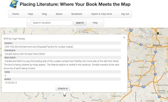 I added some scenes from SHIFT to the Placing Literature site. Donald and Helen’s home in Savannah (which I remember locating for the book using Google Maps, so that anyone who lived in the area would know that Highway 17 really turns on to the street mentioned in the novel). I put a marker at Donald’s office and Thurman’s office in the Dirksen and Rayburn buildings in D.C. And a marker at the fictional RYT hospital in Boston where they got their nano treatments. But the best was placing the silo itself in Fulton County. It helped that I flew out of Atlanta a few weeks ago, and I saw where the trees could be cleared and the skyline spotted. (Sorry state park!)