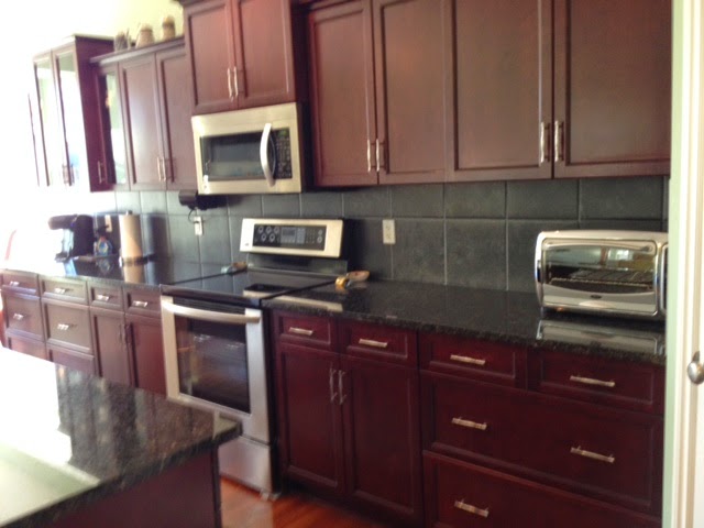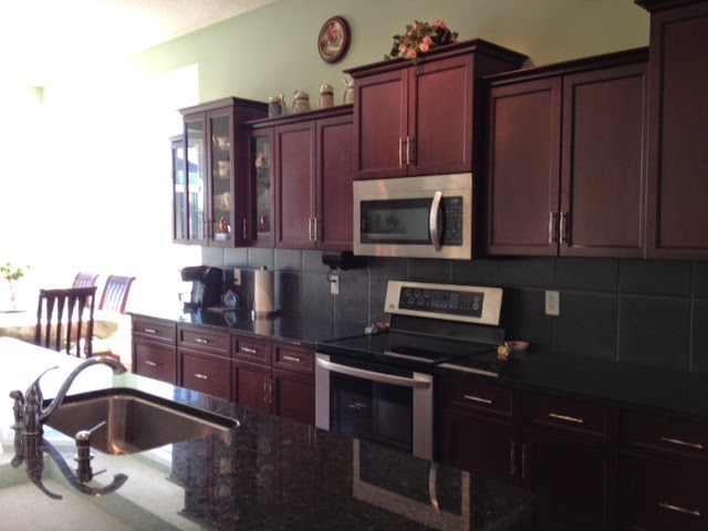 The kitchen is perfect for the home chef and features maple cupboards/drawers (some with slide-out shelves) in a cherry wood stain, a massive kitchen island, garburator, extra-large sink, granite counters and ceramic tile backsplash that ties in to fireplace tiles. Two pantries provide extra storage space.