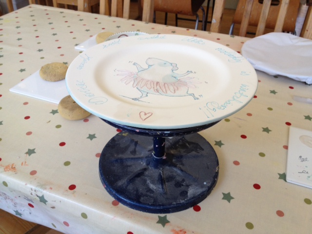 It was another one of my beautiful sisters' birthdays recently so I thought I would make her a plate that she could use everyday to remind her of the important things in life - dancing, eating cake, and feeling loved!This guinea pig character is probably my favourite from my new book Guinea Pig Party (sorry, another shameless plug!), she just makes me smile a lot! Her balletic grace and cuddly curves make her the perfect ambassador for my take on that fabulous saying of "dance like nobody's watching", and she fits perfectly into the shape of the plate too - very helpful!