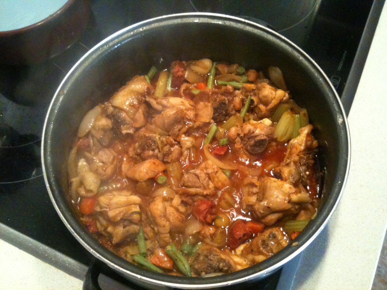 You´ll find the vegetables and chicken produce enough liquid to make a thick liquor to stop any burning. Then add the brandy, harissa paste and green beans. Cook for another five minutes.