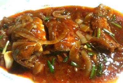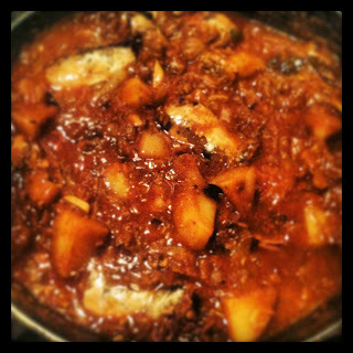 2 large onions2 medium potatoesKnob of butter6 garlic cloves12 curry leaves2 cups of water or more1/2 tsp cumin seeds1 tsp garam masala1 tsp turmeric2 tsps of extra hot chilli powder 1 tbsp tomato puree2 x 155g tins of pilchards in tomato sauce4 level tsps fish sauce1 level tsp sugar1 red chilli