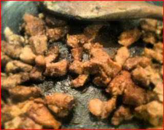 Keep stirring and browning the pork. Then finely chop the garlic and add to the pan and brown the pork for another few minutes (notice how many times I'm irritatingly using the word 'brown' - that's what the whole recipe's about). It should be evenly browned by the end (and once more). Then add a cup of water. Don’t completely submerge the pork - there should be bits sticking out.