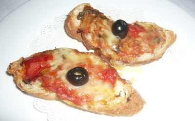 quickly arrived – two slices of baguette topped with tomato, olive, and melted