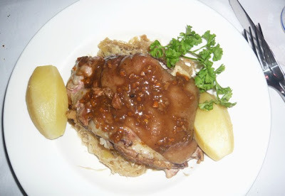 My $11.50 braised pork shank with cep confit, sitting on a bed of choucroute,
