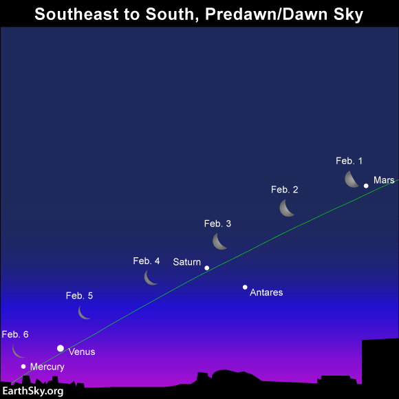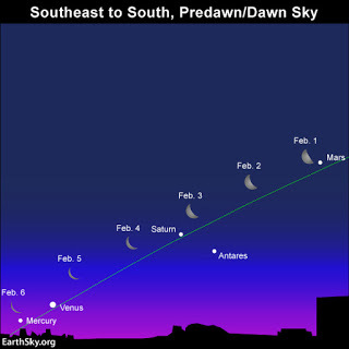 From Northern HemisphereA Planetary Party January 20th - February 20th All five visible planets will sit in a line from the horizon to the moon - for the first time since 2005. According to Dr. Tanya Hill, senior curator at the Melbourne Planetarium, there will be another chance to view the planets lined up in August, but then not again until October 2018. Venus and Jupiter will be easiest to see and Mars, while a little harder, will have a distinctive red glow to look out for. Saturn is also...