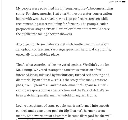 Somehow, I have to believe F.P. barreled through some professional boundaries in his quest to share some of those deeply held religious beliefs I’m always hearing about. Although it came as a shock, I wasn’t entirely unprepared, having just that morning read an opinion piece in the Wall Street Journal by a St. Paul author and life-long Democrat who voted for Trump as…a protest? Here’s a snippet: