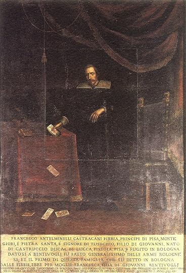 Today's image comes from Wikimedia: It's a late 1860s painting of Prince Castracani Fibbia (1360-1419) with a deck of Tarot cards – tarocco bolognese – scanned from Andrea Vitali's Il Tarocchino di Bologna. The Queen of Batons is visible, bearing the Fibbia arms. The artist is unknown.