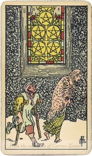 The Five of Pentacles card that illustrates this post is from an original "Pam B" Rider-Waite tarot deck that was probably printed in the 1920s.
