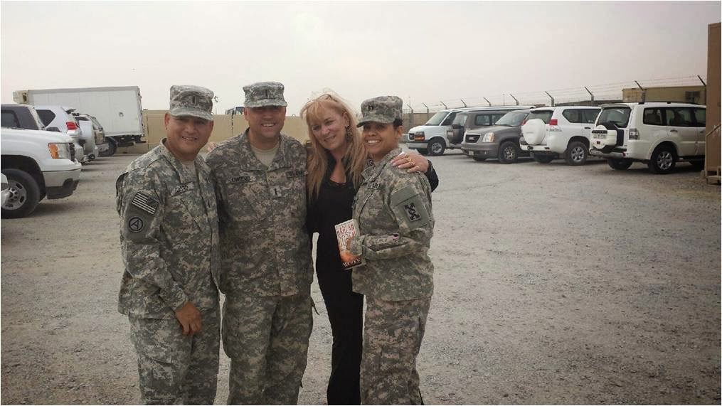 Car picks me up right on time for the airport – and then I’m off. I’m on the only plane without a baggage claim listed but I see Paul Wilson who has come in from New Jersey along with our driver. We head to our hotel and first thing that night, we’re out an on our way to a USO center at the base there. We “meet and greet.” It’s not about our books; it’s about the soldiers who want to talk to us about anything. Some want to become writers themselves. Some want to know about the process. Some are just happy to talk.There’s a joke in our family that we always get the room furthest down the hall. Mine is the very last; my co-authors on the tour tease me for being so far away. It’s okay, of course—it’s what I’m accustomed to!