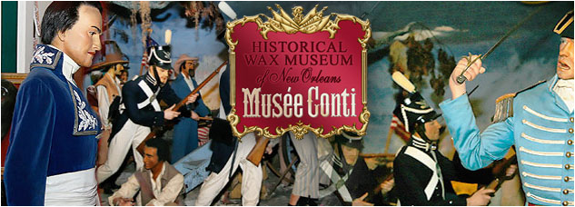 picture taken with wax figures.) But my real love is a wax museum that takes you through history and gives you the great and the traumatic events that shaped us into what we are. (Okay, I also love—love, love, love, a good chamber of horrors!) I believe that I’d be absolutely terrified if I were locked tight in a wax museum—certain that the figures would come to life and do me in. They stare with sightless eyes, and yet we believe that they see. They are cast in various stages rld we now know. That said, in broad daylight, and with friends, I am fascinated by these museums in which we see these creations that are human—and not! The Historical Wax Museum of New Orleans, Musee Conti, doesn’t set out to terrify you or delight you with images of our current ‘hot’ stars of the silver screen. What it does do is show you the history of a city—New Orleans.