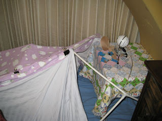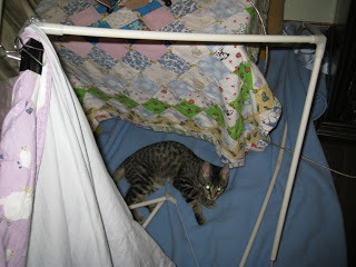 So now I have a new pre-recording task. In addition to turning off the heater and refrigerator, moving the ticking clock to the other room, applying lip balm, making sure I have hot tea and cool water at the ready, the microphone plugged in and the lap top fully charged, I also must put the kitten in the back room and close the door before I finish assembling the recording tent.