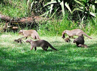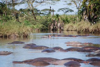 Two new Africa pictures today: Some banded mongoose (see the baby going for a ride?) and just a few hippos.