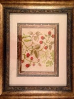 This particular piece is a lovely floral my mom did years ago and made into a pillow. I confiscated it from her Goodwill pile and placed it on my breakfast room sofa for years until age got the better of it and the linen became frayed. So I put it away, thinking I would frame it one day. Well, today I took a chance and went to Michael's, finding the perfect matted frame (on sale) that enhances the antique look. Unfortunately, I'm the only one in my family who loves these old things and finds beauty in them - most everyone else turns up their nose and sneers until they see it in our house and see what I've done with it.