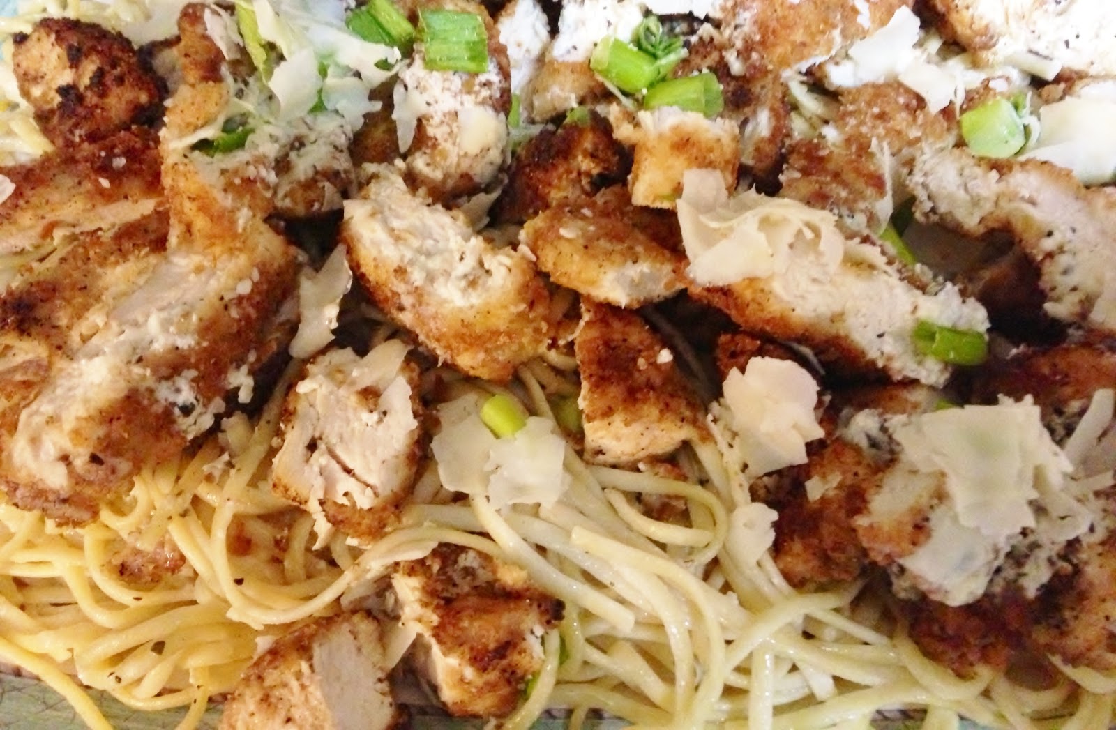 Mix sauce over cooked linguini, tossing well and making sure to reserve a bit to cover the meat. Slice the chicken and place over the linguini, drizzling remaining sauce on top. Add some scallions and shaved Parmesan cheese for the finishing touch. You might want to place in a hot oven for a few minutes before serving. Enjoy!