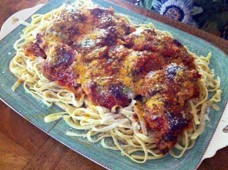 Sprinkle a bit more salt and pepper if needed and then spoon spaghetti sauce over the chicken. Top with mozzarella cheese and another shake of Parmesan and cook in a 350 degree oven for 30 min. I then turned the oven off and let the dish sit in there a little longer until the meat was good and brown. You can see that I like my cheese crunchy!