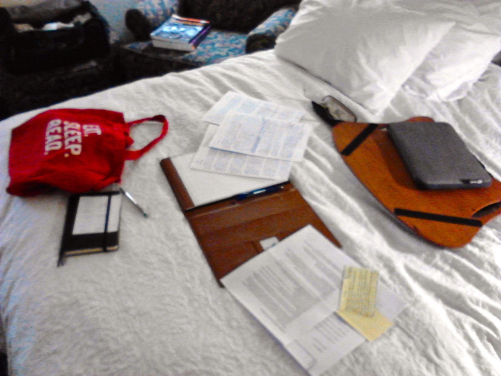 Hard work, all spread out. Notice the yellow cards. Those are my "what if's."On a whim, Brad suggested I join him for his clinicals on Thursday and Friday of this week. Between his clinicals all over the state, my martial arts and running committments, and my once-a-month short trips to somewhere for the book...we've been a bit flustered. I loved his idea immediately, booked a room at Hampton Inn via Rocketmiles (my new fave), and tossed a limited number of items into a duffel.The emphasis there is on the word "limited." Yes, I have two other major projects under deadline right now. Yes, I have three inquiries for new jobs awaiting reply in my inbox (sadly, I'm booked through August--or maybe that's a good thing). Yes, I could have used a few more hours sleep this morning instead of getting up early to hit the road. But when it came time to pack, none of the items necessary for completing those tasks made it into my bag.