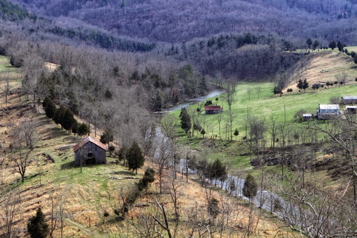 Copper Creek glimpsed from on high; I run down along the water's edge.Early evening, I move through sunshine and snowmelt, the world a cacophony of colors after weeks of white, white, white. It's all a wonder as I run along Copper Creek and let the miles reel behind me. I love the pale browns of spring. The greens as fragile as silk threads. The bony arms of sycamores reaching for the sky.