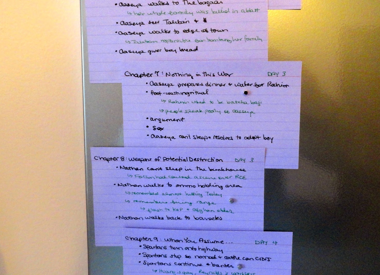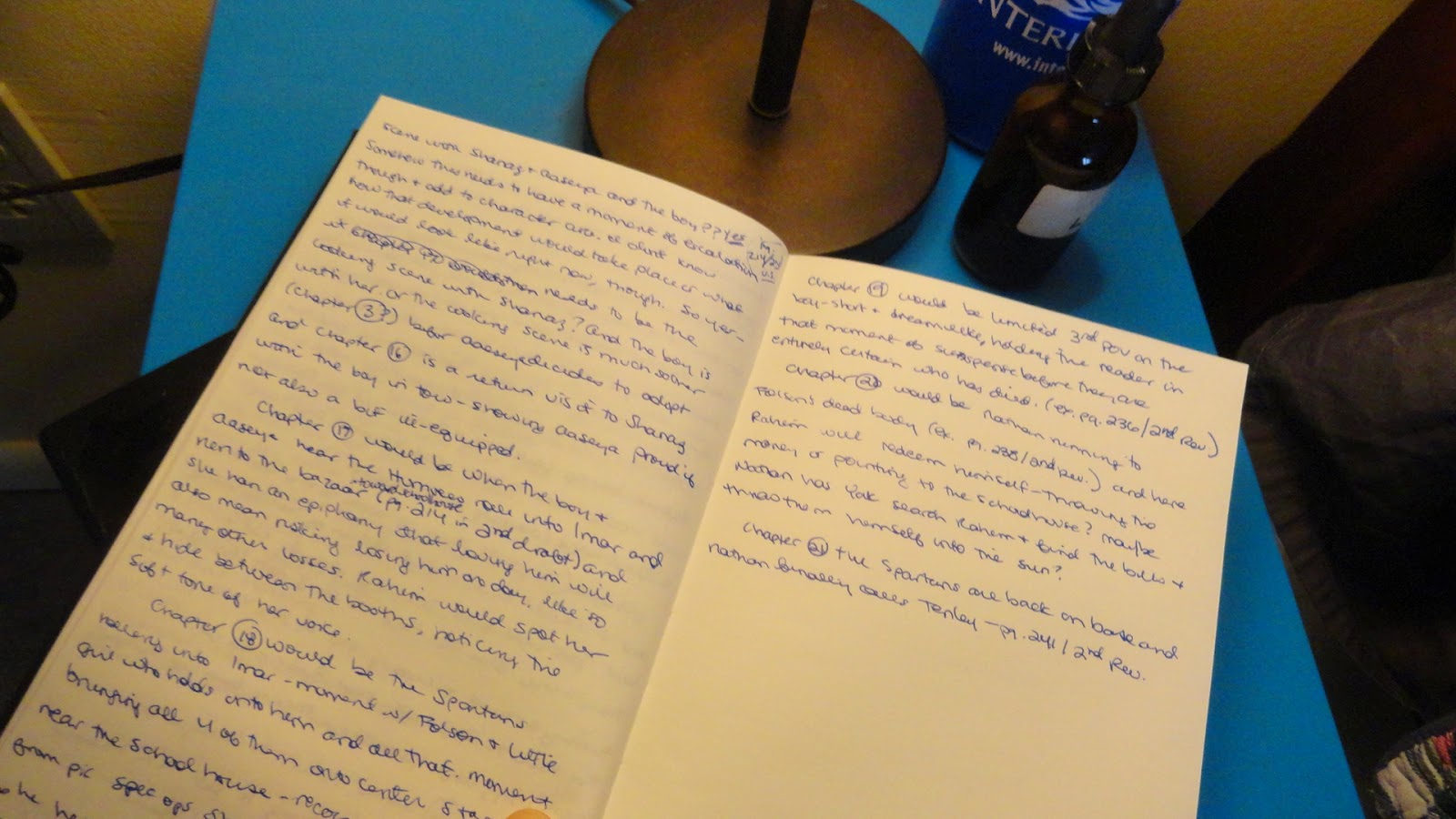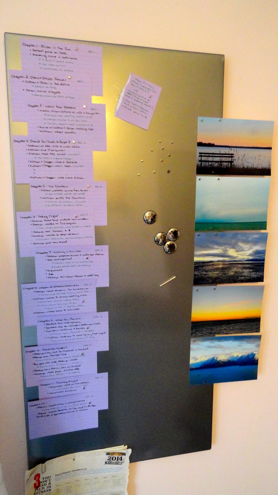 Was I being lazy? Getting derailed and distracted by upcoming travel and holidays? Letting my plot get too complicated and my ideas get the best of me, failing to write through the barriers? It was difficult to tell. After two mornings of failed chapter attempts, I set the work aside for 4 days. When I came back, nothing felt right, so I printed my entire 4th revision to date and read it through from beginning to end--something I hadn't done yet. This resulted in chapter outlines: