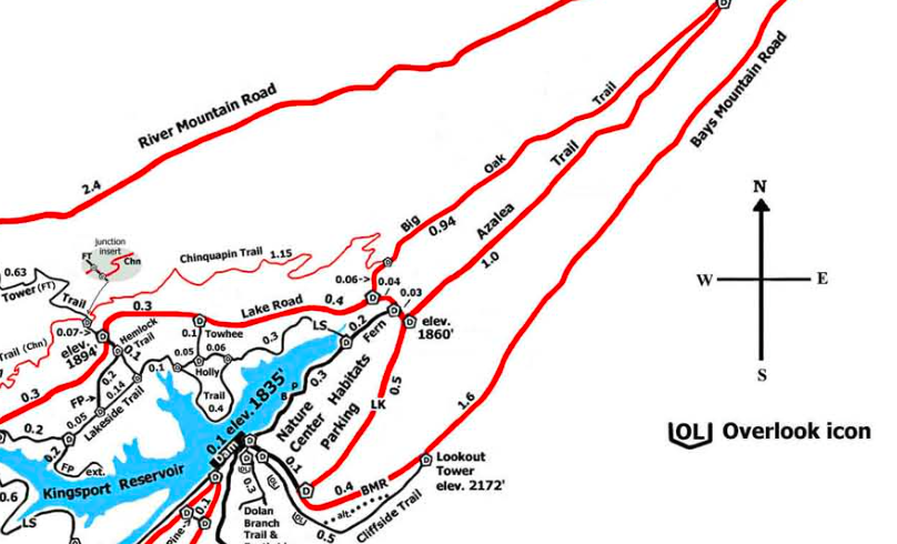 Here's a partial map of Bays Mountain Park's 39 miles of trails. The 10K included trails like Fern, Lake, Chinquapin, and Big Oak, among others.