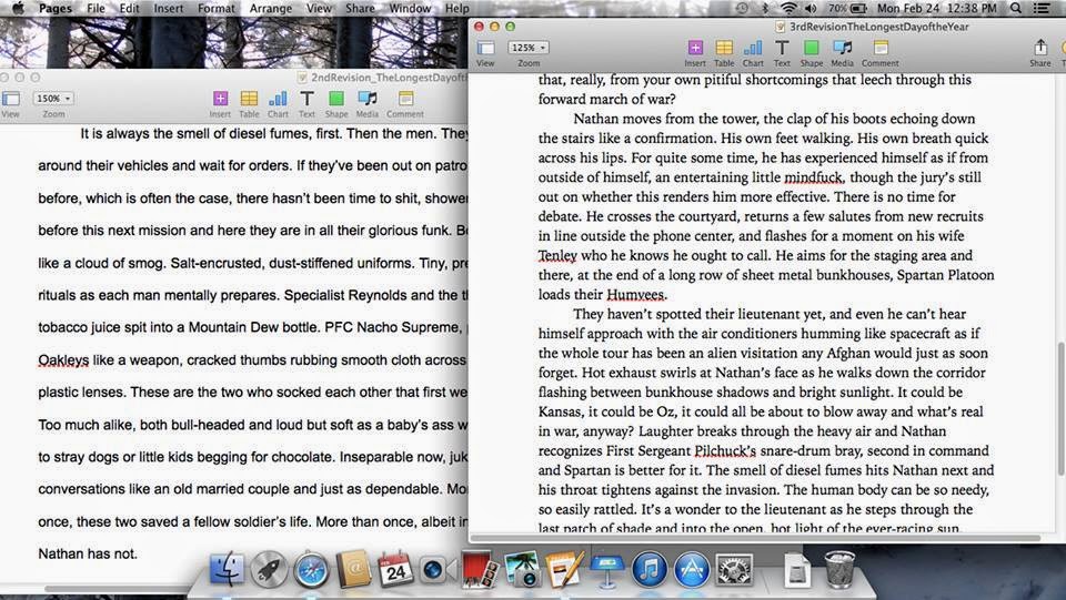 Much more time passed. Months and months and months and a lot of my book tour for Flashes of War, in fact. Finally, I came back around to make a third pass on the novel, and this is the process I've been documenting in posts this year. This time around, I did not work in the same, single document in Word. Instead, I opened the main document and then a new document, and literally typed each new word and sentence from the beginning. I did not cut and paste and I still refuse to do so. I work with both documents open side by side on my screen, like this:
