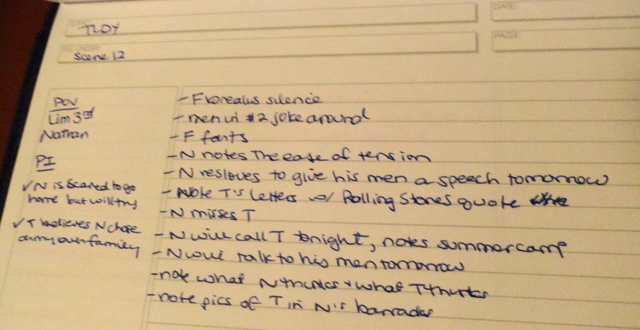 Not as telling, but basically each and every action is noted even it if it just a thought, pertinent info (PI) is checked on the side margin along with POV, and each scene is numbered. Character names are abbreviated with letters (F = Folson, as in, "Folson farts" on line three of this entry for Scene 12.)