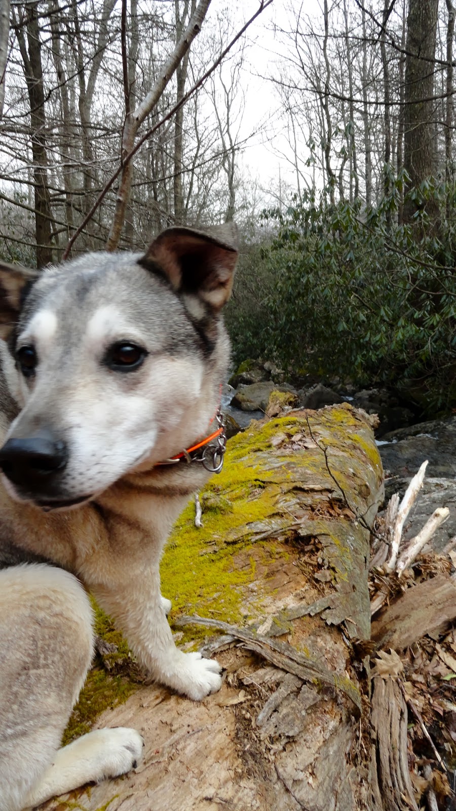 For a mile and a half we followed it, contouring Colbert Ridge, hopping over Locust Creek and contouring Locust Ridge, and then...before I knew it...I spotted a tree that I had seen before. It was this tree, in this photograph of Gus, that I took last May. This crosses White Oak Creek at the supposed "end" of the supposed "marked" and "official" White Oak Trail. We were coming in at a perpendicular and as soon as I saw the tree I knew precisely where we were--and how to get home efficiently. We crossed the creek, ignored the official trail, and continued on our merry way along the countour--not dipping down and not scrambling up. Slow and steady, over and over and over. Sideways was the name of the game and that's what kept us on track. Until...