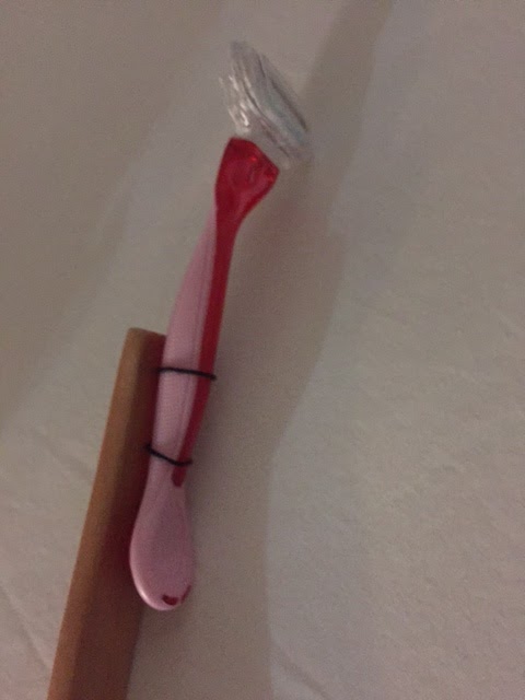 My new and improved razor on a stick. I bought razors with a curved handle to fit the best with the curved stick. One tie is to keep it from sliding and the second is to keep it stable on the handle. Razors can easily be attached with either wire, like twist ties on loaves of bread, or with plastic zip ties, or good ol' duct tape would also work. Great for quickly shaving legs in the shower or the tub with limited bending.
